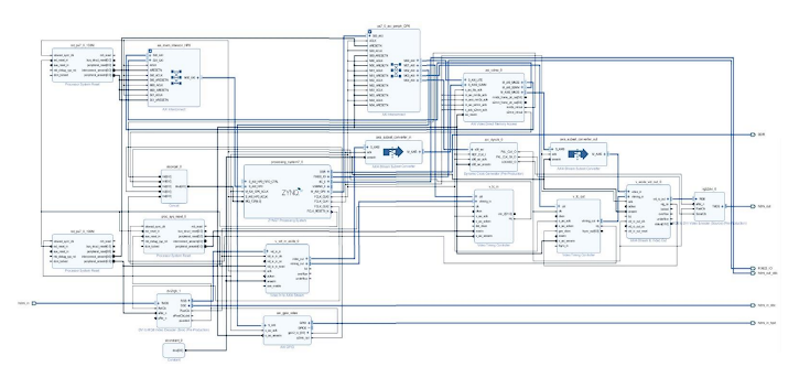 In this design layout you can see, we place an AXI direct memory access IP which provides high bandwidth memory access between the AXI peripherals that control Stream Subset Converter and AXI Stream to Video out, and other peripherals that help the board to transmit or invert the frame of the image out.